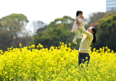 浜離宮恩賜庭園(東京都中央区)で、菜の花が見頃を迎えている。3連休の最終日、親子3人で訪れた女性は「菜という字を娘の名前につけたこともあって、毎年花の便りを楽しみにしています」と笑顔で話した=22日