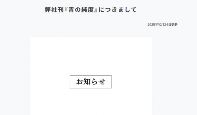 集英社の文芸編集部が24日、「文芸ステーション」公式サイトにて、同社が刊行した『青の純度』(篠田節子著)について声明を発表した。 【画像】「憶測をもとに事実…