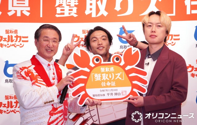 お笑いコンビ・見取り図(盛山晋太郎、リリー)が18日、都内で開かれた『蟹取県ウェルカニキャンペーン発表会』に登場。イベントに同席した鳥取県の平井伸治知事にトリ…