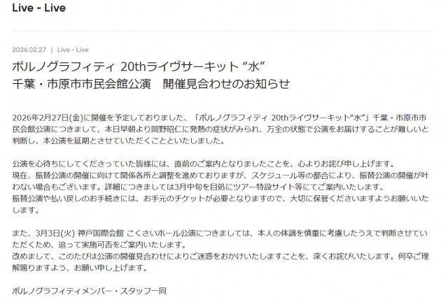 ポルノグラフィティが27日、公式サイトとSNSを更新。きょう27日に千葉で予定していた公演について、開催見合わせを発表。ボーカル・岡野昭仁(51)に発熱の症状…