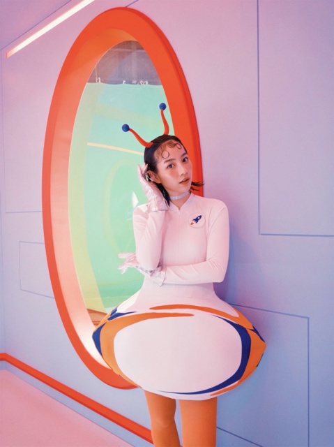 白を基調としたボディラインにフィットする近未来的な衣装に、オレンジとネイビーの大胆なデザインが施された立体的なスカートを合わせたユニークなスタイル、頭にはアンテナのようなカチューシャをつけ、額にはくるりとしたフィンガーウェーブ風のヘアアレンジ、メタリックなグローブやシルバーシューズを合わせるなど、細部までこだわりが光る“宇宙人の配達員”姿のオフショットを多数公開した。