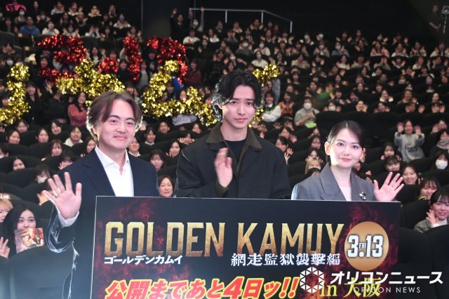 俳優・山崎賢人(※崎=たつさき)、山田杏奈が9日、大阪市内で行われた映画『ゴールデンカムイ 網走監獄襲撃編』公開直前舞台あいさつに、松橋真三プロデューサーとと…