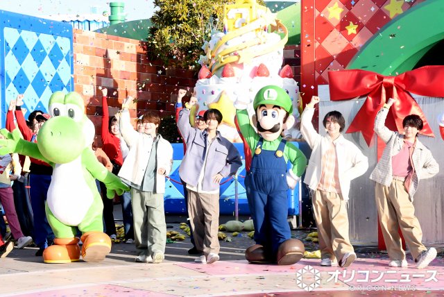 そこに駆けつけたなにわ男子は、マリオ、ルイージ、ピーチ姫、ヨッシー、キノピオと一緒に、「土管」を抜けて、巨大ケーキが飾られた「スーパースター・プラザ」(エリア入口)に登場。レアな集合ショットが実現した。