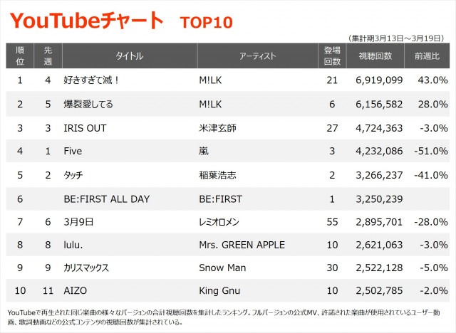 【YouTubeチャート】M!LK「好きすぎて滅!」1位返り咲き BE:FIRSTの新曲が初登場