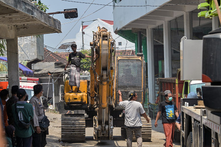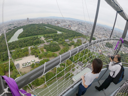 世界遺産「百舌鳥・古市古墳群」のうち、大山古墳(仁徳天皇陵古墳)を望むことができるガス気球の運航が4日、堺市で始まる。写真は記念式典で、テープカットした大阪府の吉村洋文知事(右から3人目)ら。
