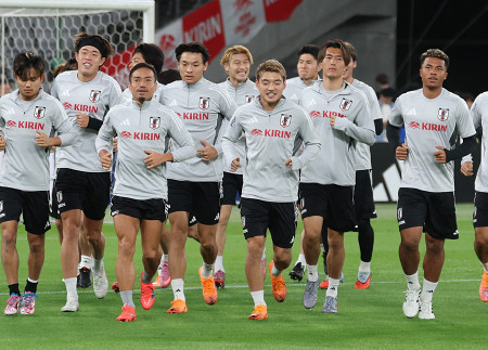サッカー日本代表は14日、東京・味の素スタジアムで行われる国際親善試合でブラジル代表と対戦する。写真は調整する日本代表=13日、東京・味の素スタジアム