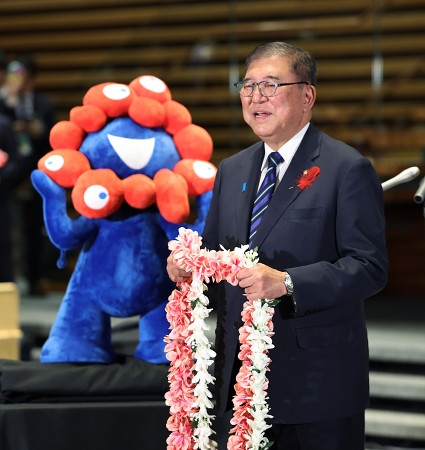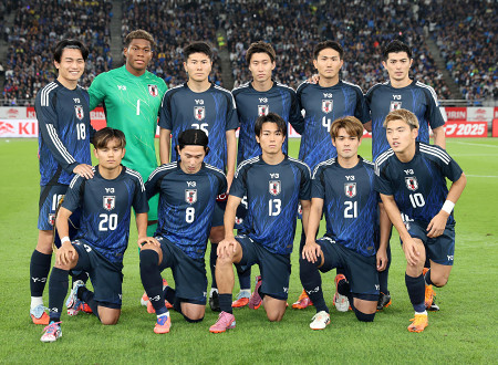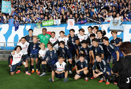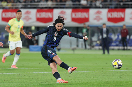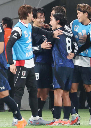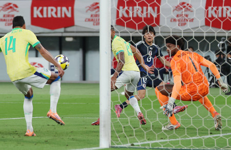 サッカーの国際親善試合は14日、東京・味の素スタジアムで行われ、日本代表はブラジル代表を3―2で破り、歴史的勝利を挙げた。写真は後半、同点ゴールを決める中村(右から2人目)。