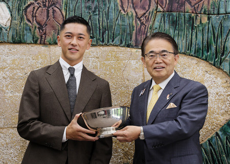 愛知県の大村秀章知事(右)は17日、同県一宮市出身で車いすテニスの小田凱人選手の表敬訪問を受けた=名古屋市中区