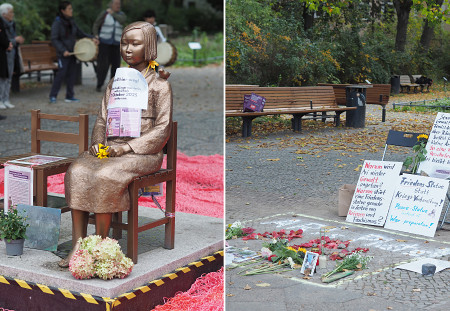 ベルリン市ミッテ区は17日、区が管理する歩道上に設置されていた従軍慰安婦を象徴する少女像を撤去したと明らかにした。写真は、設置されていた少女像(写真左)と撤去された後の様子(同右)。
