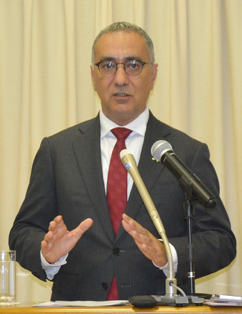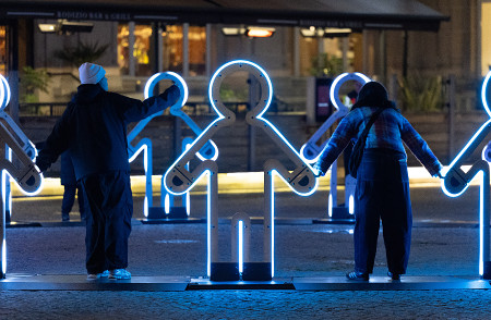 23日、英中部リバプールで、円形に並べられた光る人型のオブジェと手をつなぐことで光や音が変化していく作品を楽しむ人たち。24日から来月2日まで開かれる屋外アートイベントのテーマは「光の科学」。