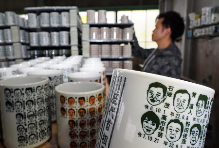 岐阜県土岐市の「山志製陶所」で、高市早苗首相の似顔絵を描き加えた湯飲みの生産が進められている。似顔絵は専務の加藤貴仁さん(33)が担当。「予約数はかなり多い」などと語った=24日撮影