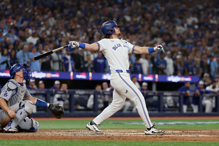 米大リーグの今季王者を決めるワールドシリーズ(7回戦制)は24日、カナダのトロントで開幕し、ブルージェイズがドジャースを11―4で破った。写真は6回、満塁本塁打を放つブルージェイズの代打・バーガー。