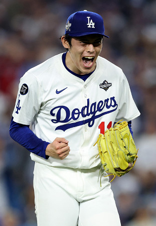 ワールドシリーズ第3戦、ブルージェイズ戦の9回を無失点に抑え、雄たけびを上げるドジャース6番手の佐々木=27日、ロサンゼルス