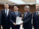 全国知事会と韓国の市道知事協議会は12日、ソウル近郊の仁川市で日韓知事会議を開いた。出席者らは、経済活性化や人口減少といったテーマについて議論した。写真は記念撮影する知事ら。