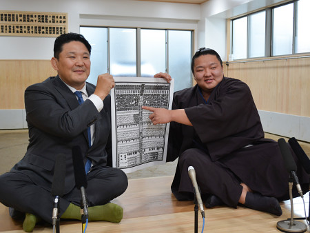 「2025年報道写真展」を訪れ、自身とトランプ米大統領の写真パネルの前で撮影に応じる高市早苗首相=22日午前、東京都中央区の日本橋三越本店