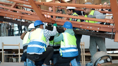 世界中の万博に通い、「万博おばあちゃん」の愛称で知られる山田外美代さん(左)が「万博を訪れた最多日数」のギネス世界記録の認定を受けたことが、大阪観光局の定例記者会見で発表された=23日、大阪市中央区