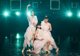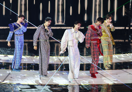 第76回NHK紅白歌合戦で歌唱する天童よしみさん(中央)。左はCANDY TUNE、右はFRUITS ZIPPER=12月31日、東京・渋谷のNHKホール