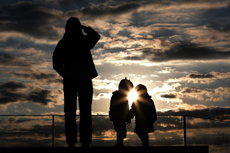 新年を迎えた1日、都心の商業施設・渋谷スクランブルスクエアの屋上展望台から2026年の初日の出を望む親子