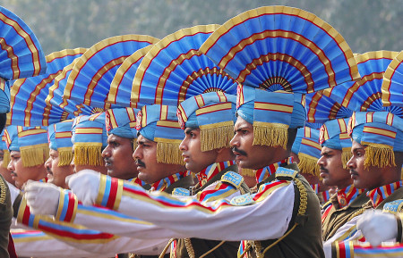 21日、インドの首都ニューデリーで色鮮やかなかぶりものを着用し、パレードのリハーサルに参加する人々。憲法公布を祝う26日の共和国記念日に向け、準備に余念がない。