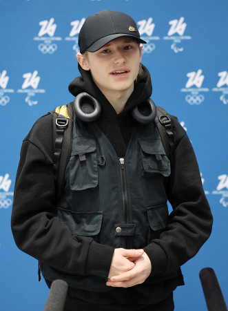 6日に開幕するミラノ・コルティナ五輪の日本選手団の本隊が1日、ミラノ・マルペンサ空港に到着した。写真は空港に到着した日本選手団の伊東秀仁団長(手前左)ら。