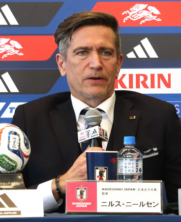 サッカーのJ1鹿島と茨城県などは12日、県立のメルカリスタジアムを解体し、新スタジアムを2033年夏を目標に開業すると発表した。写真は鹿島の小泉文明社長(左)と同県の大井川和彦知事(中央)ら=水戸市