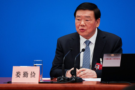 会見する全人代報道官