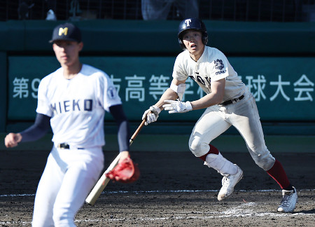 第98回選抜高校野球大会第8日は26日、甲子園球場で2回戦が行われ、英明(香川)は東北(宮城)を6―3で破り、春夏通じて初のベスト8。 写真は完投勝利し、笑顔を見せる英明の松本倫。