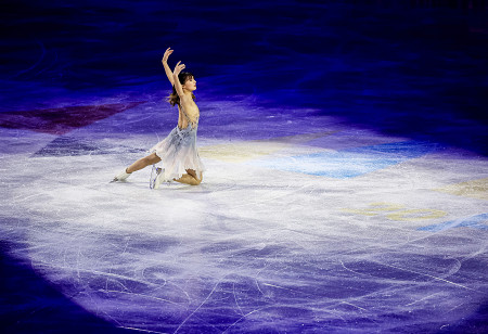 世界選手権のエキシビションで演技する坂本花織。今季限りで引退する坂本にとって、選手として最後の滑り。持ち前の美しいスケーティングでファンを魅了し、司会者からはこれまでの功績も紹介された=29日、プラハ