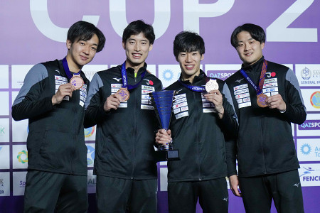 フェンシングのワールドカップ、男子エペ団体で銅メダルを獲得し、撮影に応じる日本の(左から)松本龍、古俣聖、加納虹輝、古田育男=29日、アスタナ〔c〕(公社)日本フェンシング協会