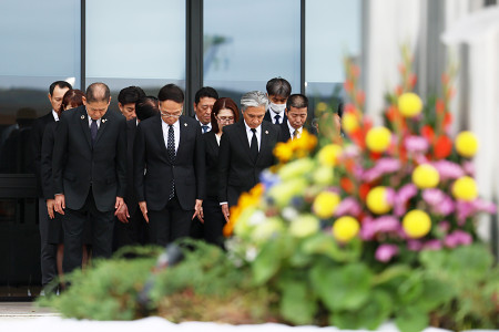 熊本地震の前震から10年となった14日、熊本県益城町では町職員ら約40人が犠牲者の冥福を祈った。午前8時半の始業前、西村博則町長(前列左端)や町職員らは町役場近くの献花台に黙とうし、白い花を手向けた。