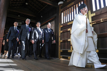 超党派の「みんなで靖国神社に参拝する国会議員の会」(会長・逢沢一郎衆院議員)は22日、東京・九段北の靖国神社を春季例大祭に合わせて集団参拝した。自民党や日本維新の会などから120人超が参加した。