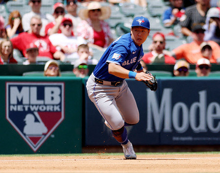 ブルージェイズの岡本はエンゼルス戦に7番三塁で出場し、9回に3試合ぶり安打となる左前打を放って3打数1安打、1四球だった。ブルージェイズは3―7で敗れ、連勝は3で止まった=22日、アナハイム