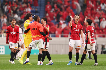 明治安田J1百年構想リーグは29日、各地で第13節の10試合が行われ、東は浦和が川崎に2―0で勝ち、PK戦を含む連敗を7で止めた。写真は喜ぶ浦和イレブン=29日、埼玉